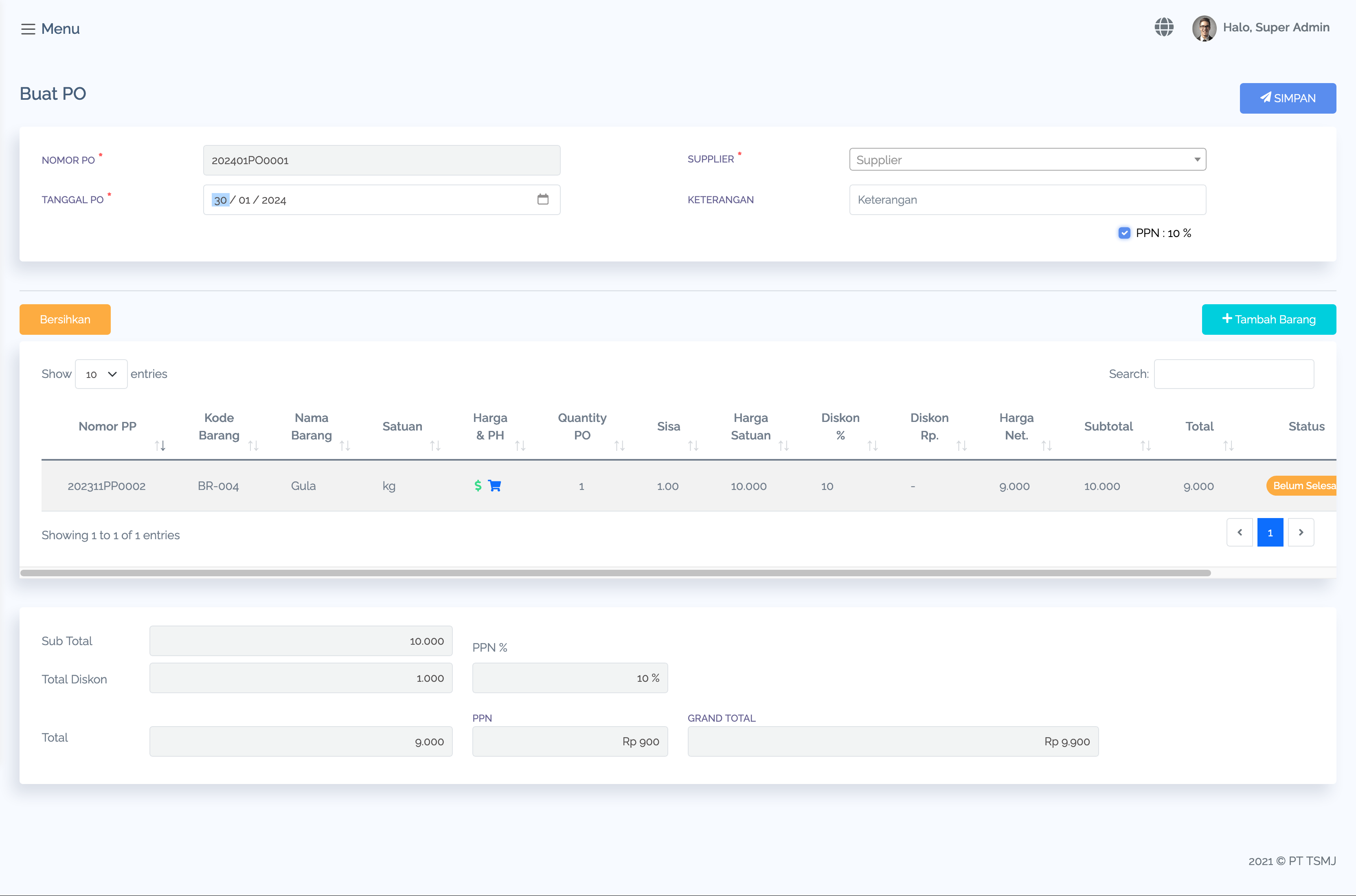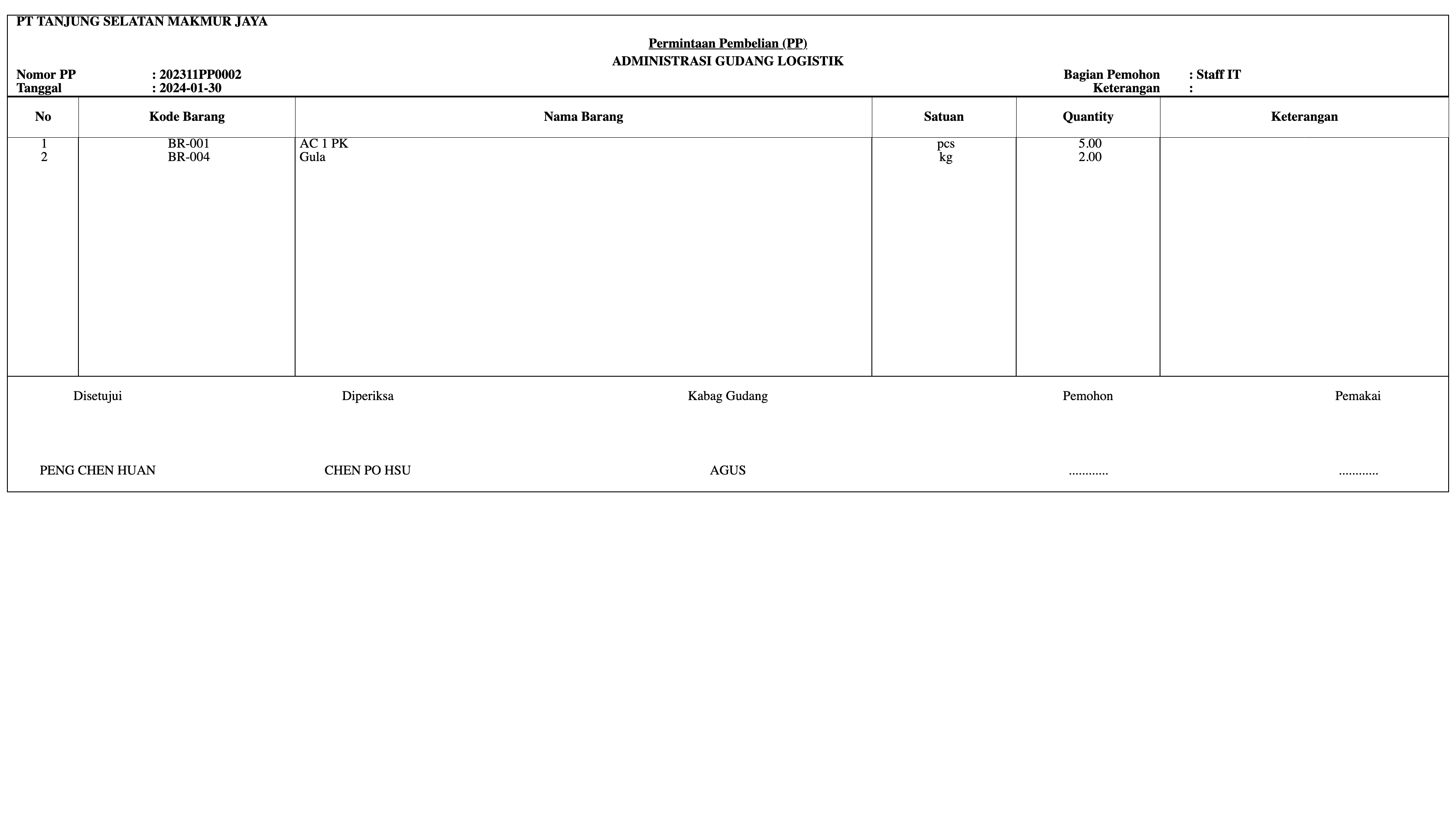 This logistics application has many features and can work in a structured manner. With this application, we can find out the stock of goods in the warehouse, the average price of the goods, the last purchase price, so that the user will receive a notification if the stock is running low. This warehouse application will also record the goods procurement process. starting from purchase requests, the process of searching for goods from several suppliers, to recording the receipt of goods.